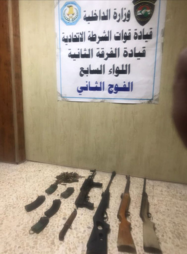 وذكرت قيادة الشرطة الإتحادية في بيان تلقت بغداد24 نسخة منه: ان قوة من اللواء السابع الفرقة الثانية شرطة إتحادية بالأشتراك مع مفارز استخبارات اللواء التابعة لوكالة الأستخبارات والتحقيقات الإتحادية واجب دهم وتفتيش على السلاح غير المرخص.