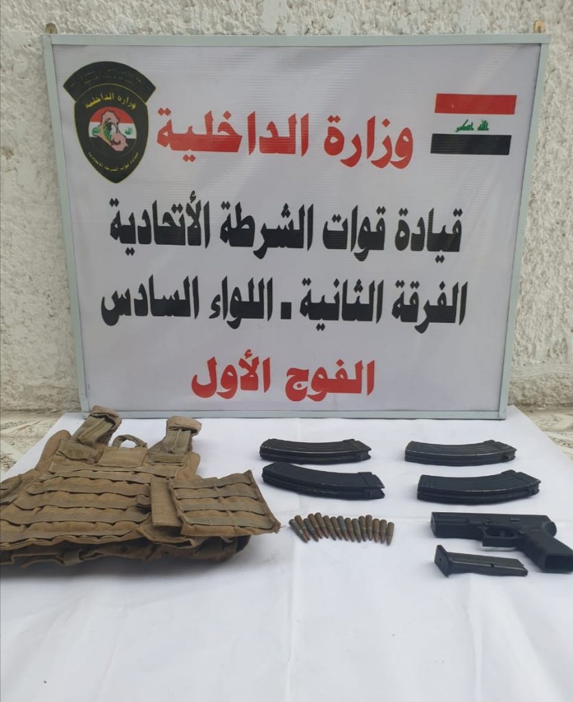 وبينت, ان قوة من الفوج الاول اللواء السادس للفرقة نفذت عملية تفتيش على السلاح غير المرخص في منطقة (الشرطة الخامسة) ببغداد، أسفرت العملية عن العثور على مسدس صوتي، 4 مخازن بندقية، 15 إطلاقة بندقية، درع نسيجي, مشيرة, انه تم ضبط جميع المواد والتعامل معها اصوليًا .