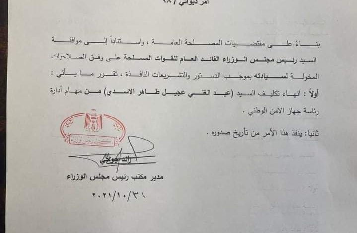 إنهى امر ديواني اليوم الثلاثاء 2 نوفمبر 2021, تكليف عبد الغني الاسدي من مهام رئاسة جهاز الأمن الوطني وتكليف حميد رشيد بمهام تسيير شؤون جهاز الأمن الوطني بموافقة رئيس مجلس الوزراء مصطفى الكاظمي وبتوقيع من مدير مكتب رئيس مجلس الوزراء, حصلت بغداد24 نسخة منهما