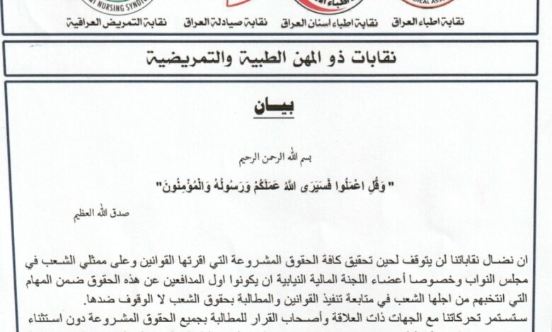 وذكرت نقابات – اطباء العراق – اطباء اسنان العراق – صيادلة العراق – التمريض العراقية، في بيان تلقت بغداد24 نسخة منه،