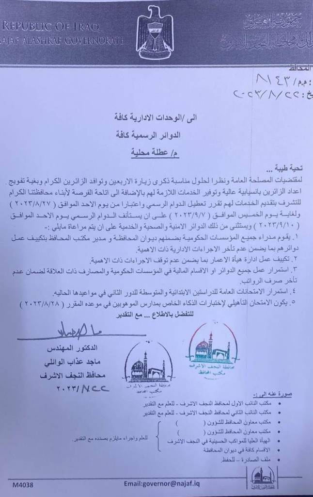 بالوثيقة.. النجف تعطل الدوام الرسمي لمدة 10 أيام
