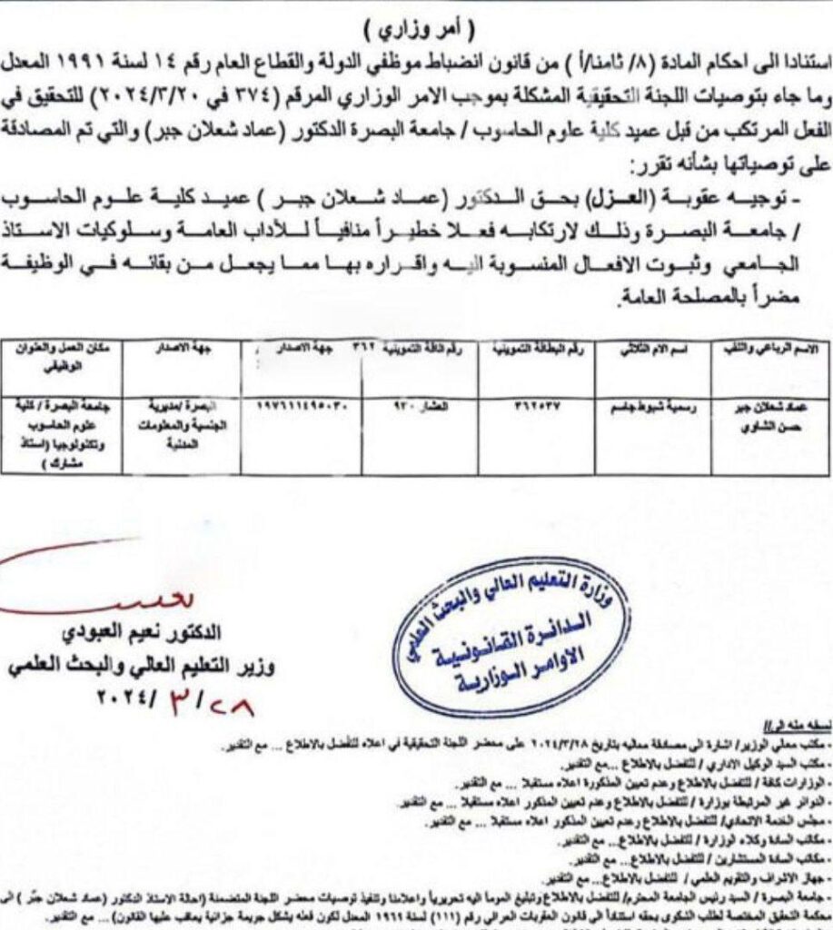 وجاء في أمر وزاري ورد لوكالة بغداد 24، “استنادا الى احكام المادة (۸/ ثامنا لاً) من قانون انضباط موظفي الدولة والقطاع العام رقم 14 لسنة ۱۹۹۱ المعدل. وما جاء بتوصيات اللجنة التحقيقية المشكلة بموجب الأمر الوزاري المرقم ( 374) في ۲۰۲4/۳/۲0) للتحقيق في الفعل المرتكب من قبل عميد كلية علوم الحاسوب / جامعة البصرة الدكتور عماد شعلان (جبر) والتي تم المصادقة على توصياتها بشأنه تقرر توجيه عقوبة (العزل) بحق الدكتور ( عماد شعلان جبر ) عميد كلية علوم الحاسوب / جامعة البصرة وذلك لارتكابه فعلا خطيراً منافياً للآداب العامة وسلوكيات الاستاذ الجامعي وثبوت الافعال المنسوبة اليه وإقراره بها مما يجعل من بقائه في الوظيفة مضراً بالمصلحة العامة.