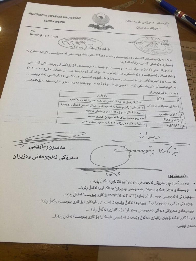 بالوثيقة.. حكومة كوردستان تصدر أوامر تعيين خريجي المجموعة الطبية