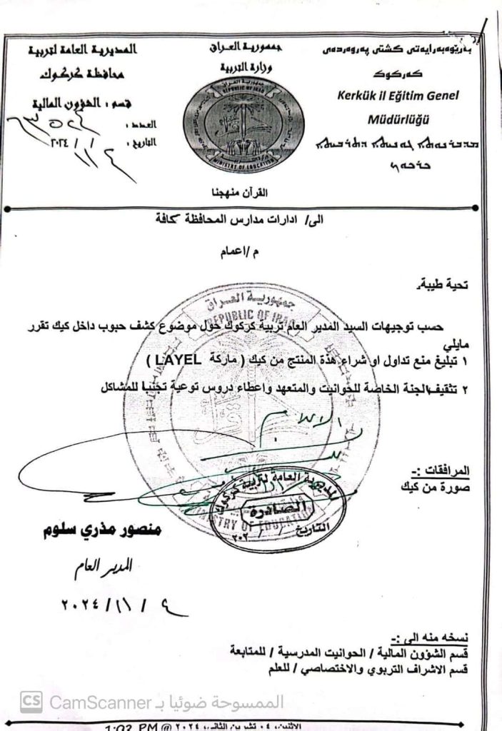 وقالت التربية، في كتاب رسمي حصلت عليه وكالة بغداد 24، إنه “حسب توجيهات مدير عام تربية كركوك منصور مذري سلوم، تقرر منع تداول او شراء منتج نوع كيك LAYEL ويتم تبليغ الحوانيت والمتعهد بقيامهم بإعطاء دروس توعية تجنبا للمشاكل”.