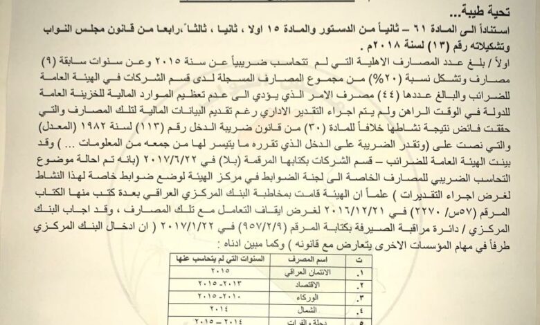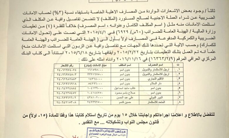 واشار الى” وجود بعض الاشعارات الواردة للمصارف الاهلية باستيفاء نسبة (٣٪) لحساب الامانات الضريبية عن شراء العملة الاجنبية لصالح المستورد المكلف لا تتضمن تفاصيل وافية عن هذا المكلف الذي استلمت الامانات منه مثلا اسم المكلف الكامل او عنوانه او عنوان المصرف وكل ذلك خلافا للفقرة (٤) من تعليمات وزارة المالية /الهيئة العامة للضرائب.