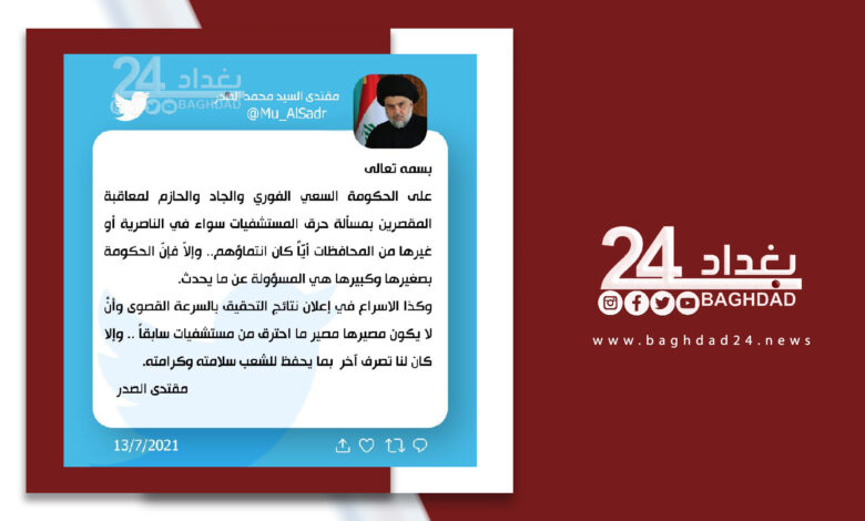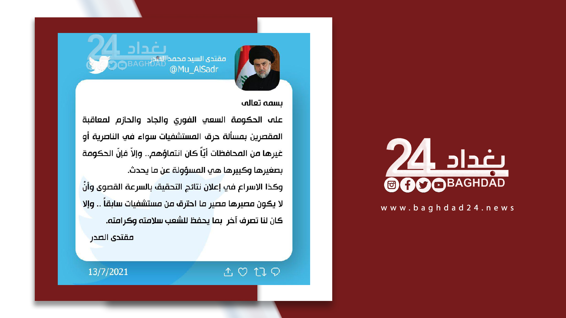 صرح السيد مقتدى الصدر في تغريده على حسابه بتوتر اليوم الثلاثاء 13 تموز 2021 على الحكومة محاسبة المقصرين بحرق المستشفيات وإلا سيكون لنا تصرف اخر يحفظ للشعب سلامته وكرامته