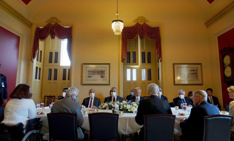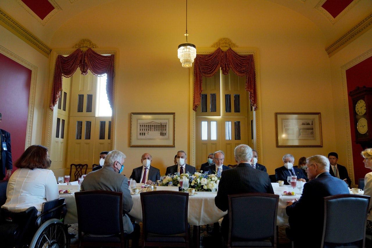 التقى رئيس مجلس الوزراء مصطفى الكاظمي، اليوم الأربعاء 29 تموز 2021 ، في واشنطن، زعيم الأغلبية عن الحزب الديمقراطي في مجلس الشيوخ الأمريكي السيد تشاك شومر، وزعيم الأقلية الجمهورية ميتش ماكونيل، وعدداً من أعضاء مجلس الشيوخ من الحزبين الجمهوري، والديمقراطي.