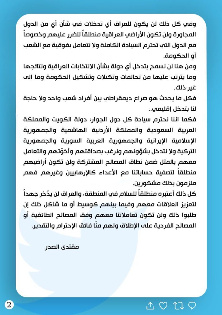 حذر زعيم التيار الصدري السيد مقتدى الصدر اليوم الأحد 24 أكتوبر 2021, دول الجوار العراقي من التدخل في نتائج الانتخابات وما يترتب عليها من تحالفات.