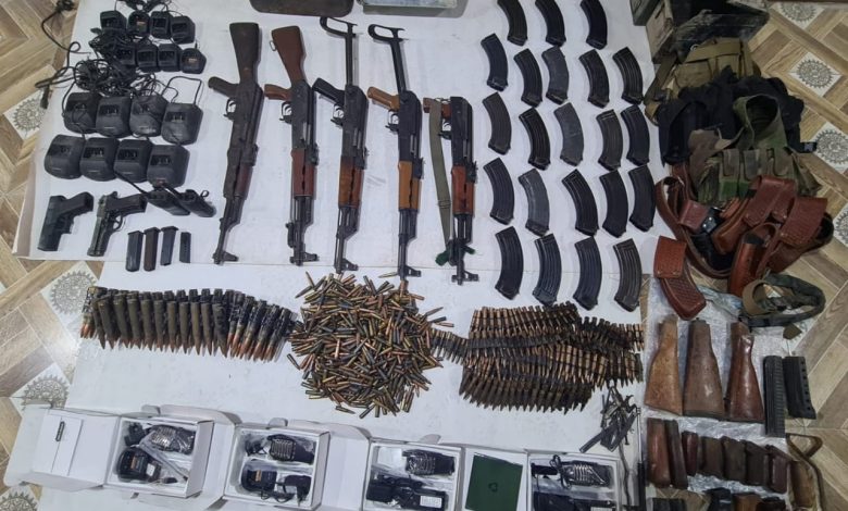 وأوضحت المديرية إن العملية أسفرت عن العثور على 5 بنادق مختلفة الانواع، 22 مخزن بندقية كلاشنكوف، 550 إطلاقة بندقية كلاشنكوف، مسدسين و4 مخزن مسدس، 4 شريط سلاح BKC، أجهزة نداء مختلفة الانواع عدد 6 مع 16 قاعدة شحن، شريط سلاح 12.7مع حاوية عتاد، 9قبضة بندقية،4 جعبة مخازن بندقية،4 أخمص بندقية.