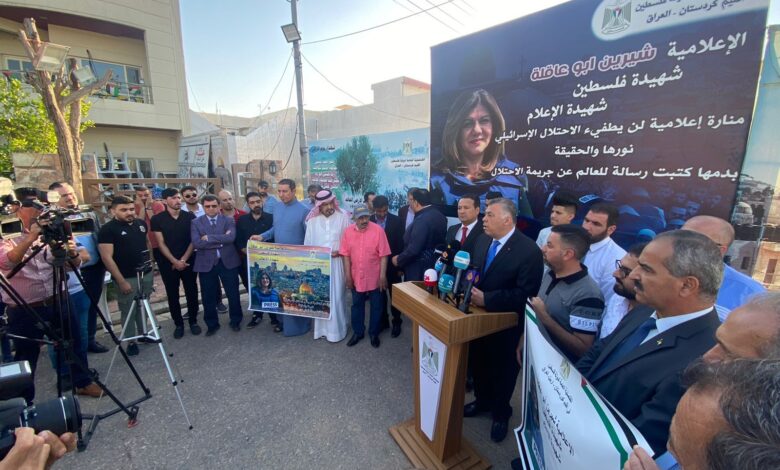 نظم عدد من الصحفيين والناشطين المدنيين في مقر القنصلية العامة لدولة فلسطين في اقليم كردستان العراق , وقفة احتجاجية تعبيرا عن الانتهاكات الخطيرة التي يقوم بها جيش الاحتلال الاسرائيلي باستهداف المدنيين العزل واستشهاد الزميلة شيرين ابو عاقلة مراسلة قناة الجزيرة الفضائية في فلسطين .