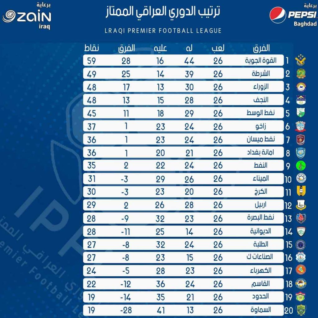 ترتيب الدوري العراقي بعد نهاية الجولة 26