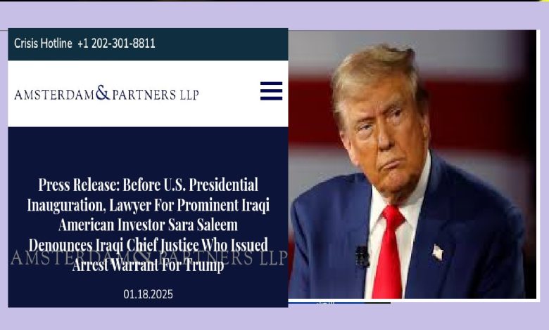 تداولت مواقع التواصل الاجتماعي , البيان الصحفي قبل تنصيب الرئيس الأمريكي ترامب ، الذي يخص محامية المستثمرة الأمريكية العراقية البارزة سارة سليم التي نددت برئيس القضاء العراقي الذي أصدر مذكرة اعتقال بحق ترامب , وتم توزيع البيان الصحفي التالي على وسائل الإعلام اليوم: لندن، 18 يناير 2025 – قبل تنصيب الرئيس السابع والأربعين للولايات المتحدة، دونالد ترامب، في واشنطن العاصمة، يندد المحامي روبرت أمستردام، الشريك المؤسس لشركة أمستردام وشركاه، بأحدث تصرفات القاضي العراقي فائق زيدان، وهو قاضٍ أجنبي معروف بإصدار مذكرة اعتقال ضد الرئيس الأمريكي.