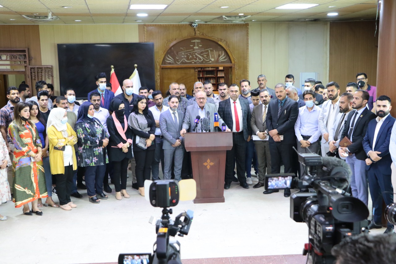 أقامت نقابة المحامين العراقيين، اليوم الأحد وقفة إحتجاجية، في مقرها، على خلفية ٱغتيال المحامي حيدر الموسوي من غرفة محامي البصرة، لأسباب مهنية .